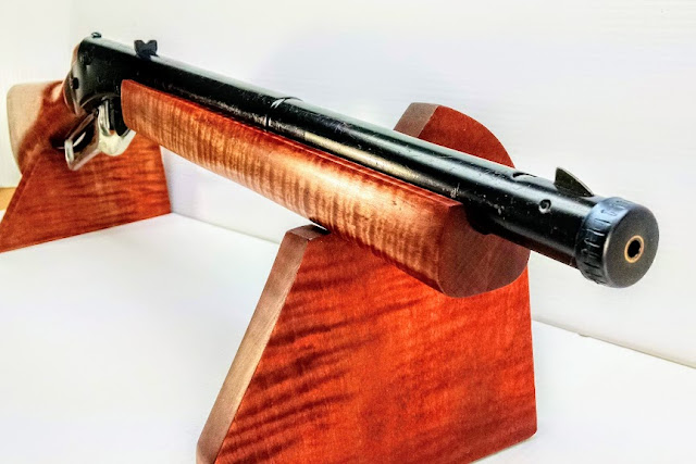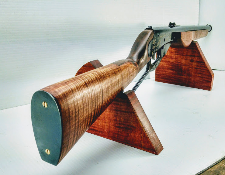 I decided that I would do some applique work on this one so I removed the factory stain with a wipe down with acetone followed by a light sanding to 220 grit. Next I went to the scrap bin and pulled out some trims from other stocks and glued them up on the wrist of the butt stock and fore end to provide some pop. I then hit it with two coats of my wood dye formulation for fiddleback maple and let it air dry for a day or two. Once dry, I applied a heavy coat of Danish oil followed by a light coat applied with 320 grit wet/dry paper to knock down the fuzz and let that sit long enough to dry. Then it's polishing time. The effect is pretty nice and very smooth to handle.