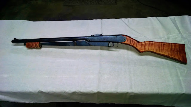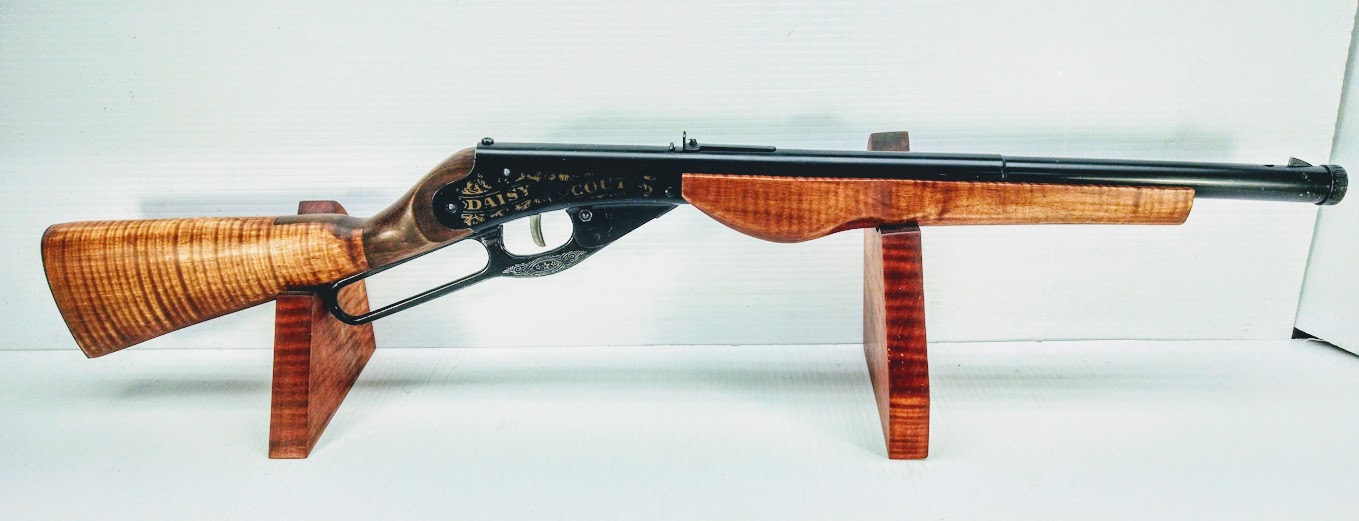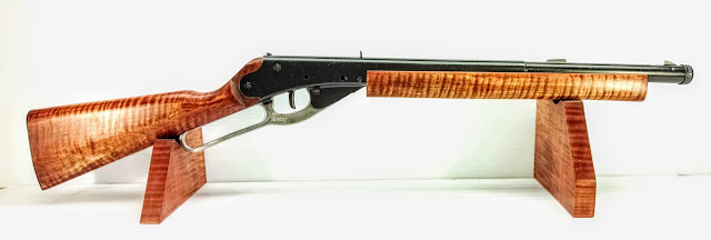 If that is enough and you're done, fine. But if you want to add a couple of easy touches that really make the gun stand out then redo the stock. The current production daisy has a Chinese hardwood stock of some description, I don't know anything about wood in China but this gun had something akin to poplar on it. The wood is very light and this unit had a tightish grain pattern hidden under the coat of stain/finish applied at the factory.